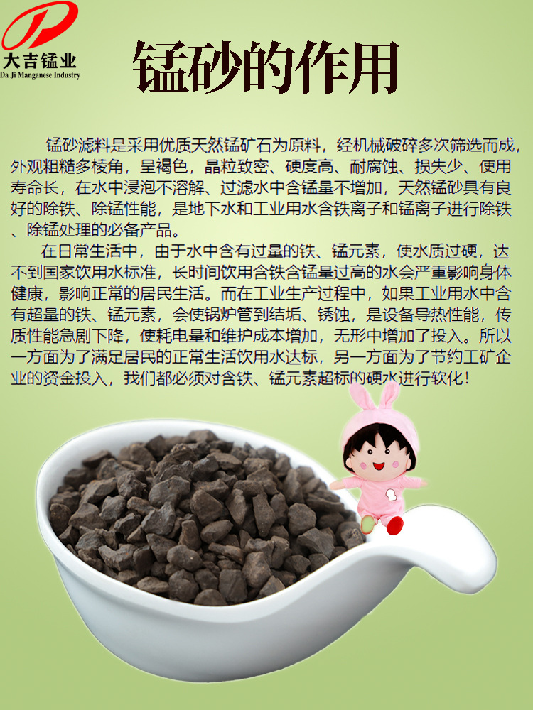 湖南大吉錳業(yè)有限公司是國內(nèi)大型的錳砂濾料、洗爐錳礦,二氧化錳生產(chǎn)基地,位于優(yōu)質(zhì)錳礦資源較為豐富的湖南省衡陽市耒陽市,企業(yè)專注專業(yè)錳系列產(chǎn)品的研發(fā)和生產(chǎn)。 大吉錳業(yè)始建于1995年,廠齡26年,企業(yè)歷經(jīng)二十余年始終堅持“以誠信為根本,以質(zhì)量求生存”的經(jīng)營理念穩(wěn)步發(fā)展,逐步壯大。 大吉錳業(yè)位于中國古代四大發(fā)明之一造紙術(shù)發(fā)明家—蔡倫的故鄉(xiāng)湖南省耒陽市,處于湖南省優(yōu)質(zhì)錳礦資源范圍中心。得天獨厚的地理位置,淵遠(yuǎn)流長的匠心傳承,讓企業(yè)更注重對品質(zhì)的追求。 大吉錳業(yè)創(chuàng)始注冊資金1800萬元,在隨后的26年間不斷追加投資,現(xiàn)已基本實現(xiàn)全部機(jī)械自動化生產(chǎn),擁有四條生產(chǎn)線。占地面積已達(dá)40000余平方米。